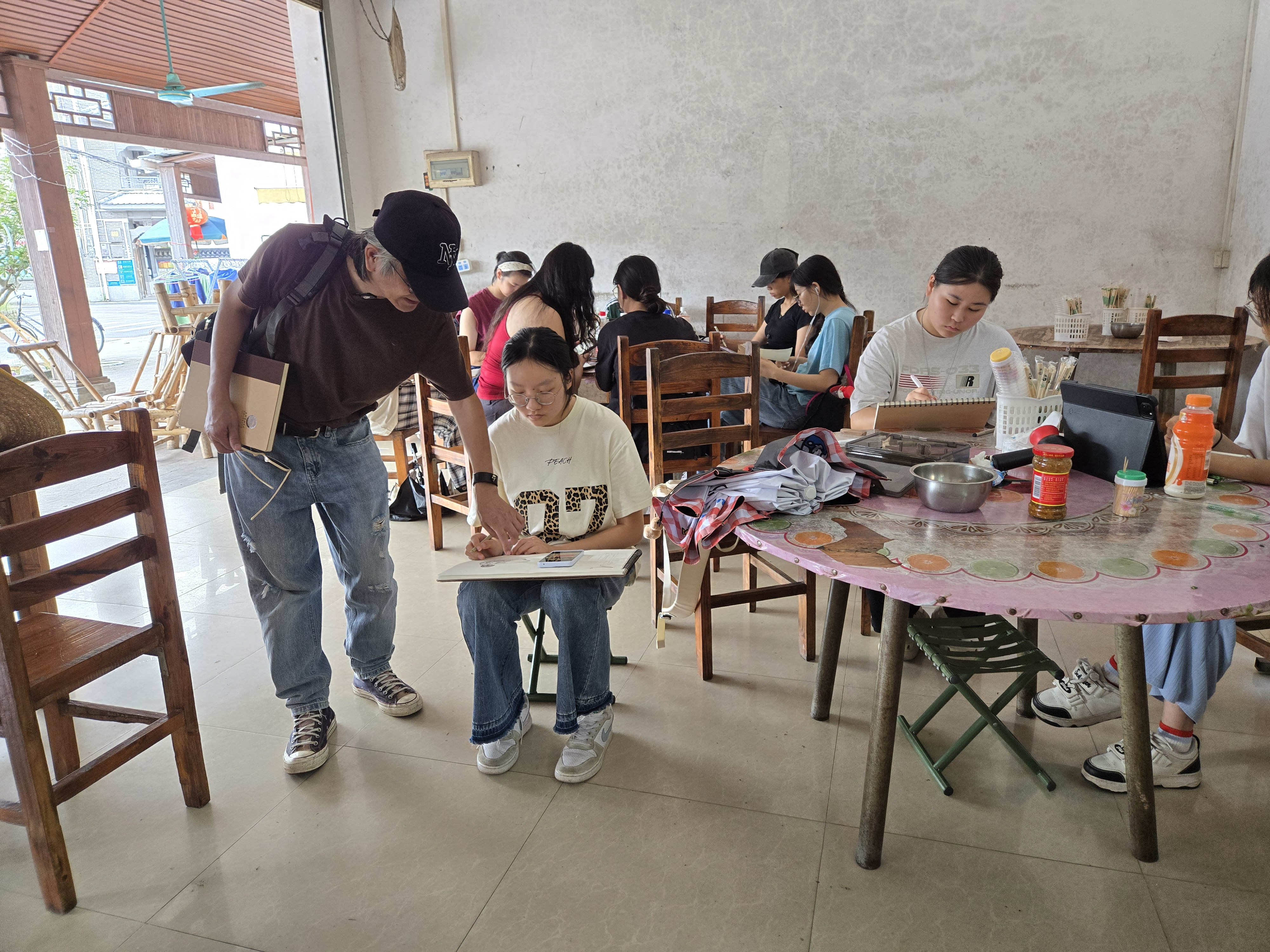 李喻军教授则在潘氏祠堂前现场示范,生动演示了如何捕捉建筑细节、构图取景以及处理光影关系。多位指导老师全程跟随,分班组织学生写生,及时给予专业指导。