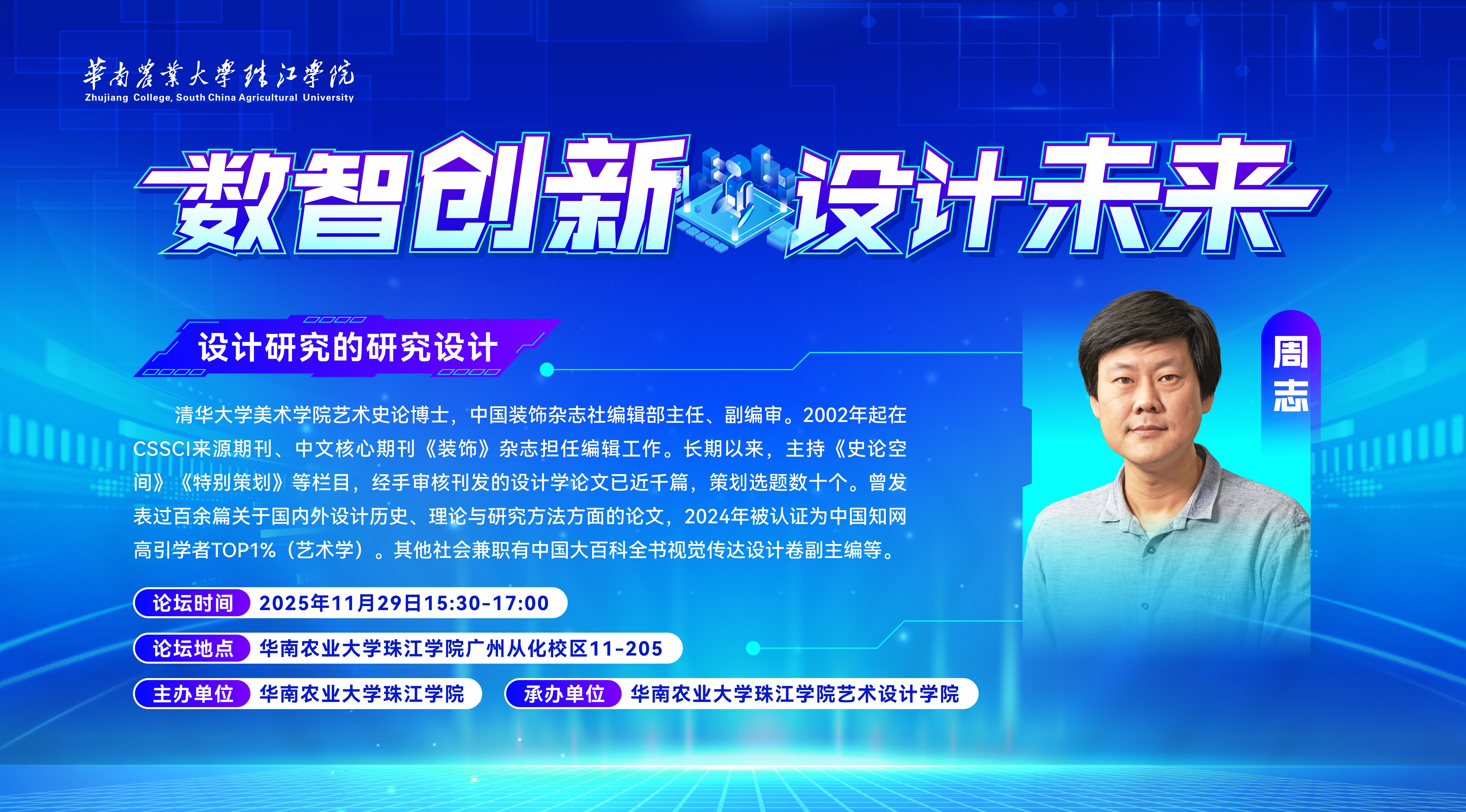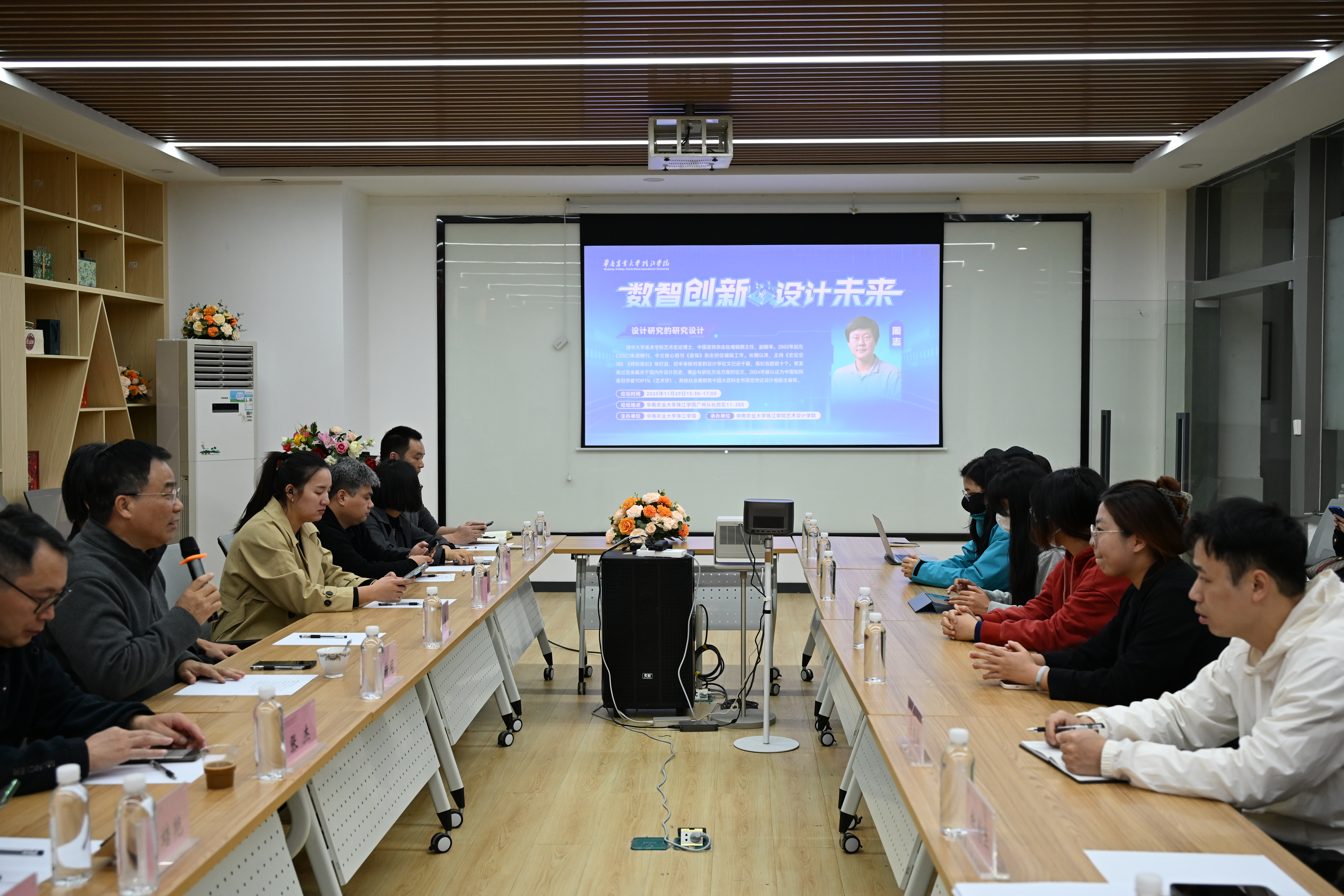 2025年11月29日,华南农业大学珠江学院艺术设计学院于广州从化校区11-205教室成功举办“数智创新·设计未来”系列学术讲座——“设计研究的研究设计”。