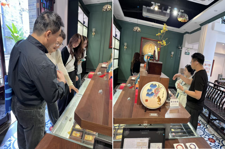 经过午间休整,调研重点转向与现代设计及市场接轨的文创领域。下午,师生们走访了余荫山房周边的文创街区,对以广府文化为灵感来源的各类文创产品进行了系统考察。大家深入主要文创商店与展览空间,从设计理念、工艺手法、产品包装到市场定位与价格体系,进行了细致的现场观察、记录和初步分析。学生们结合自身的专业知识,在走访中积极研讨,比较不同产品的设计风格与市场策略,从而更直观地理解传统文化元素在现代设计中的转化与应用逻辑。