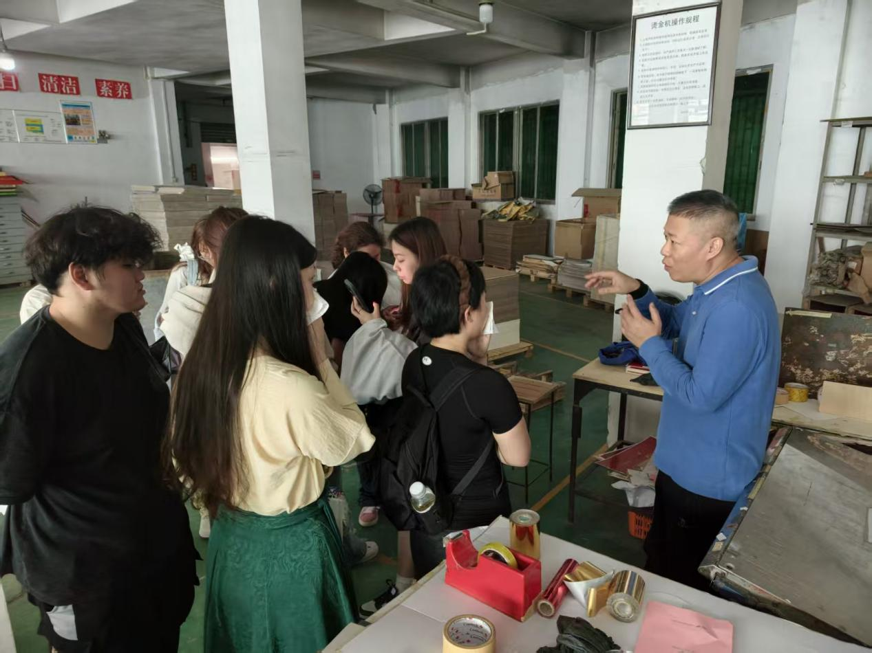 随后,师生们进入印刷车间,重点参观了胶印机的实际运作,了解了四色印刷的原理、色彩管理及校色过程,部分同学还选择性观看了丝网印刷、烫金、击凸等特色后道工艺的现场演示。在印后与质检车间,模切、覆膜、裱糊、粘盒等成品制作流程,以及严谨的质量检验与包装环节,让同学们深刻体会到从“设计图”到“手中物”的细节控制与品质要求。